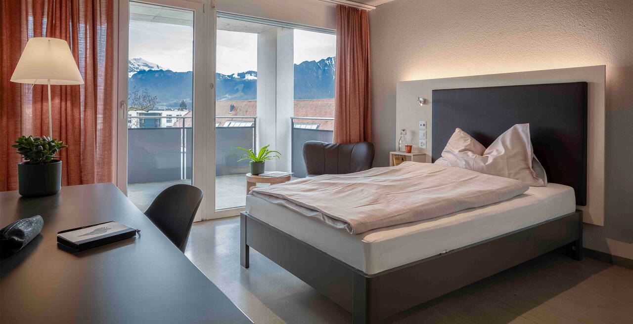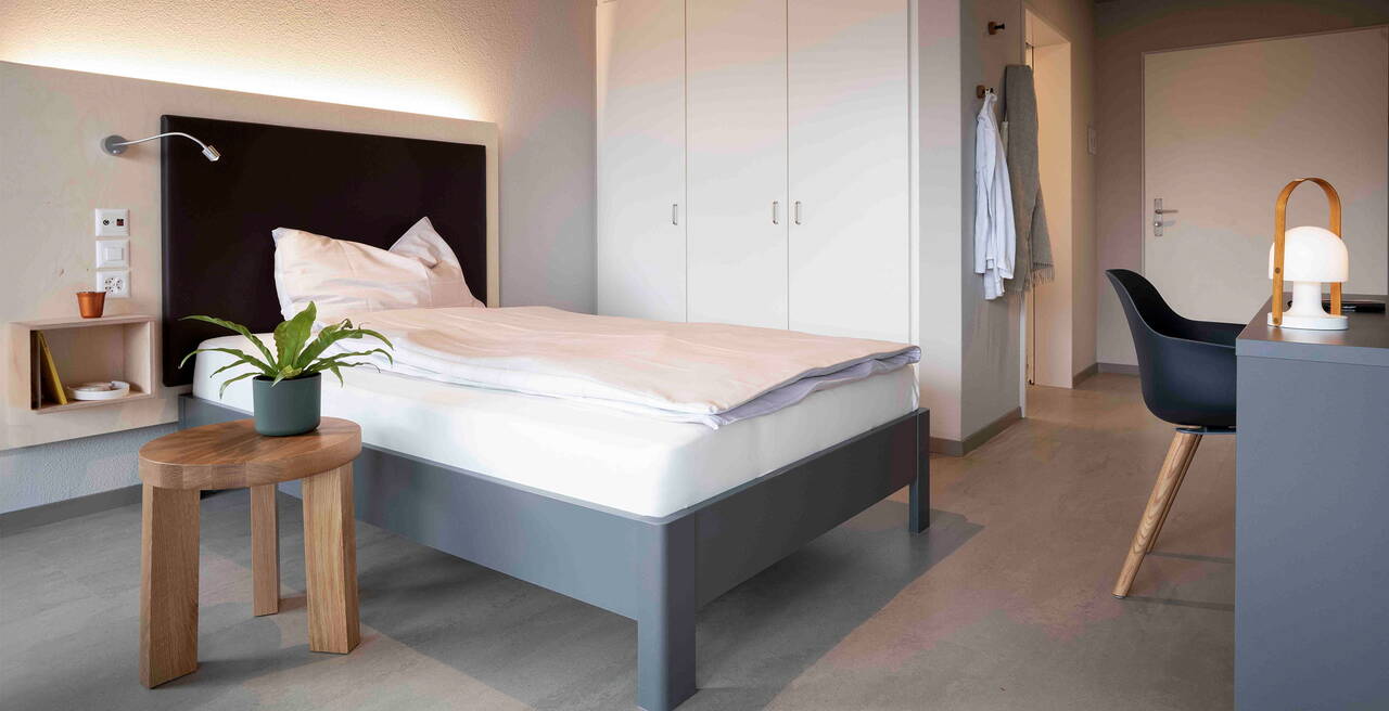 Unsere modern eingerichteten Einzelzimmer bieten einen hellen Rückzugsort, die offen gestalteten Gemeinschaftsräume laden zum Verweilen ein.
